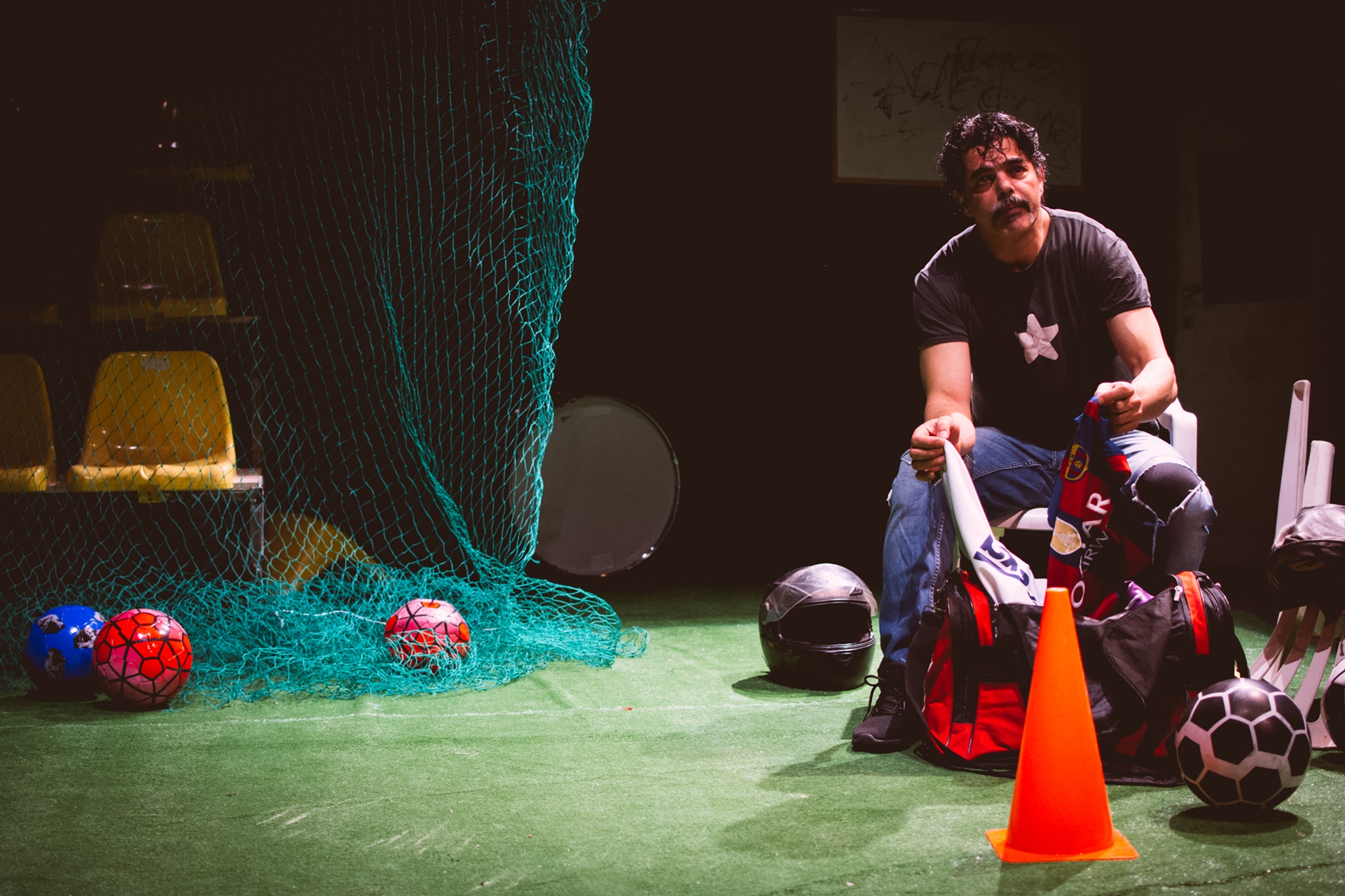 Το FOOTBALL είναι μια «σκληρή ματωμένη κωμωδία», ένας καυστικός μονόλογος με πολύ χιούμορ , που αναλύει την ιστορία της ανθρωπότητας μέσα από την ιστορία του ποδοσφαίρου, ξεκινώντας από το 1500 μ.Χ. Μιλάει για ένα αρχαίο ένστικτο του ανθρώπου να «κλωτσάει» και για μια άγρια ψυχή που βρίσκεται θαμμένη μέσα μας και αναφέρει χαρακτηριστικά: