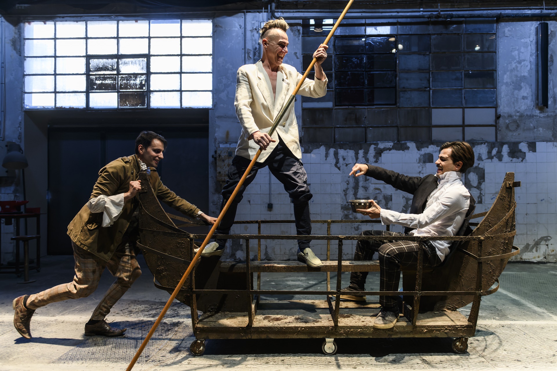 Στην καθηλωτική μεταφορά που θα παρουσιαστεί στο Τεχνοχώρο Cartel με πρωταγωνιστή τον Βασίλη Μπισμπίκη, ο πολυσύνθετος κόσμος του Αντόνιο, του Μπασίανο, της Πόρσια, του Σάιλοκ και των υπόλοιπων σαιξπηρικών ηρώων τοποθετείται σε μια Βενετία μεταβιομηχανική και δυστοπική, χωρίς νερό, με άδεια κανάλια. Μια Βενετία μέσα σε ένα άδειο εργοστάσιο, μια πόλη που δεν υπάρχει πια και όπου όλα μπορούν να συμβούν….
