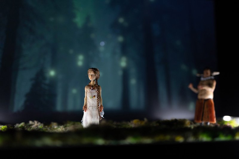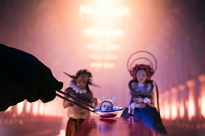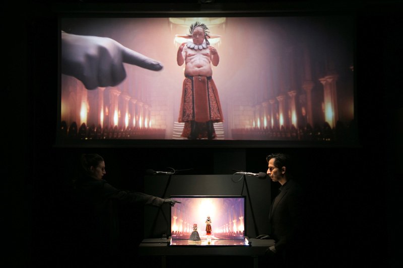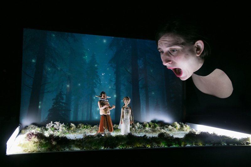 Η παράσταση που στήνει ο Παντελής Δεντάκης επί σκηνής αποτελεί κάτι το ιδιαίτερο αισθητικά, το οποίο δεν συναντάται συχνά στο θέατρο. Συνδυάζοντας τη μικρογλυπτική (Κλειώ Γκιζελή), το video art (Αποστόλης Κουτσιανικούλης), τη μουσική (Σταύρος Γασπαράτος (σε συνεργασία με τον Γιώργο Μιζήθρα)) και τον κινηματογράφο, παραδίδει μια ευφάνταστη απόδοση ενός βίαιου παραμυθιού, της οποίας βασικά συστατικά είναι οι καλοσχηματισμένες μινιατούρες της Κλειώς Γκιζελή, στις οποίες δίνουν φωνή και ψυχή ο Πολύδωρος Βογιατζής και η Κατερίνα Λούβαρη-Φασόη. Παράλληλα, ενώ εστιάζει στην αφηγηματική διάθεση του κειμένου, για την κορύφωση επιλέγει ένα έξυπνα δοσμένο μείγμα αφήγησης και έντονου διαλόγου, προκειμένου να διαχωρίσει τον καταρράκτη των σκέψεων από την εκρηκτική αλληλεπίδραση των τριών βασικών χαρακτήρων. Παρ’ όλα αυτά, ο σταθερός ρυθμός της αφήγησης οδηγεί σε στιγμές μονοτονίας, που αποπροσανατολίζουν το ενδιαφέρον του θεατή.