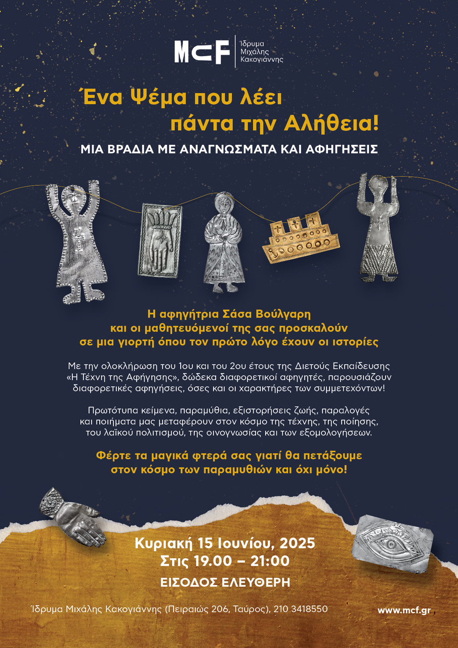 Το ίδρυμα Μιχάλης Κακογιάννης, η αφηγήτρια Σάσα Βούλγαρη και οι μαθητευόμενοί της σας προσκαλούν σε μια γιορτή όπου τον πρώτο λόγο έχουν οι ιστορίες!