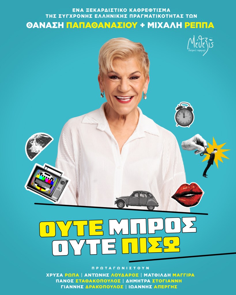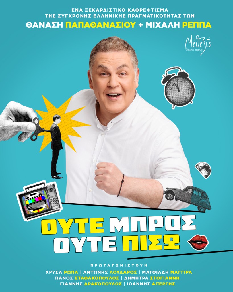 Ο Θανάσης Παπαθανασίου και ο Μιχάλης Ρέππας, σε παραγωγή της εταιρείας Μέθεξις του Χρήστου Τριπόδη, παρουσιάζουν αυτό το καλοκαίρι σε όλη την Ελλάδα τη νέα τους παράσταση «Ούτε Μπρος ούτε Πίσω».