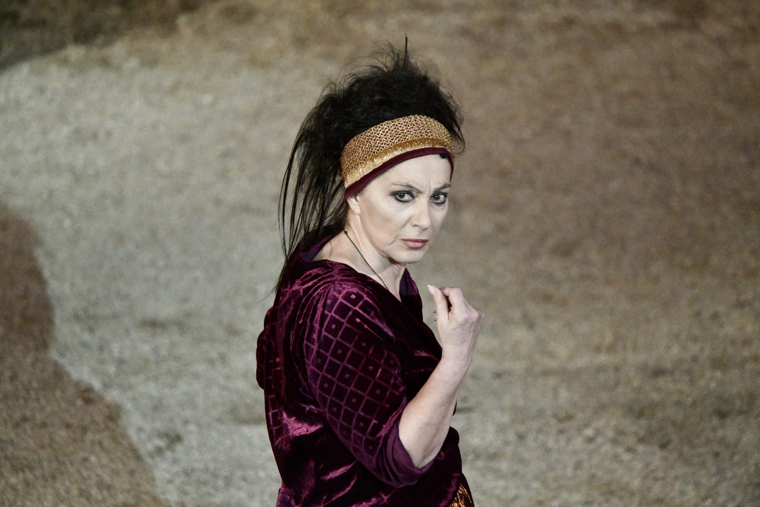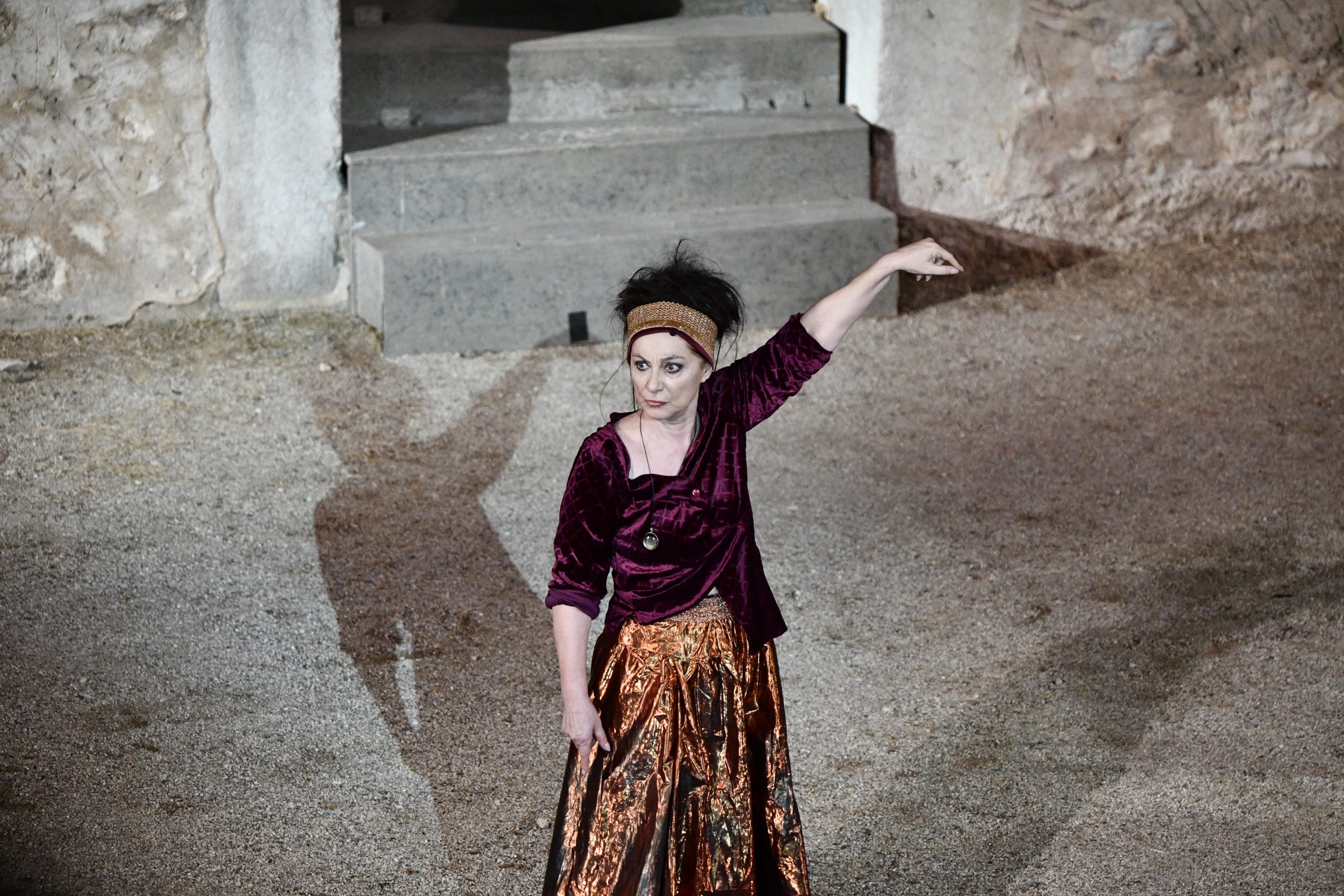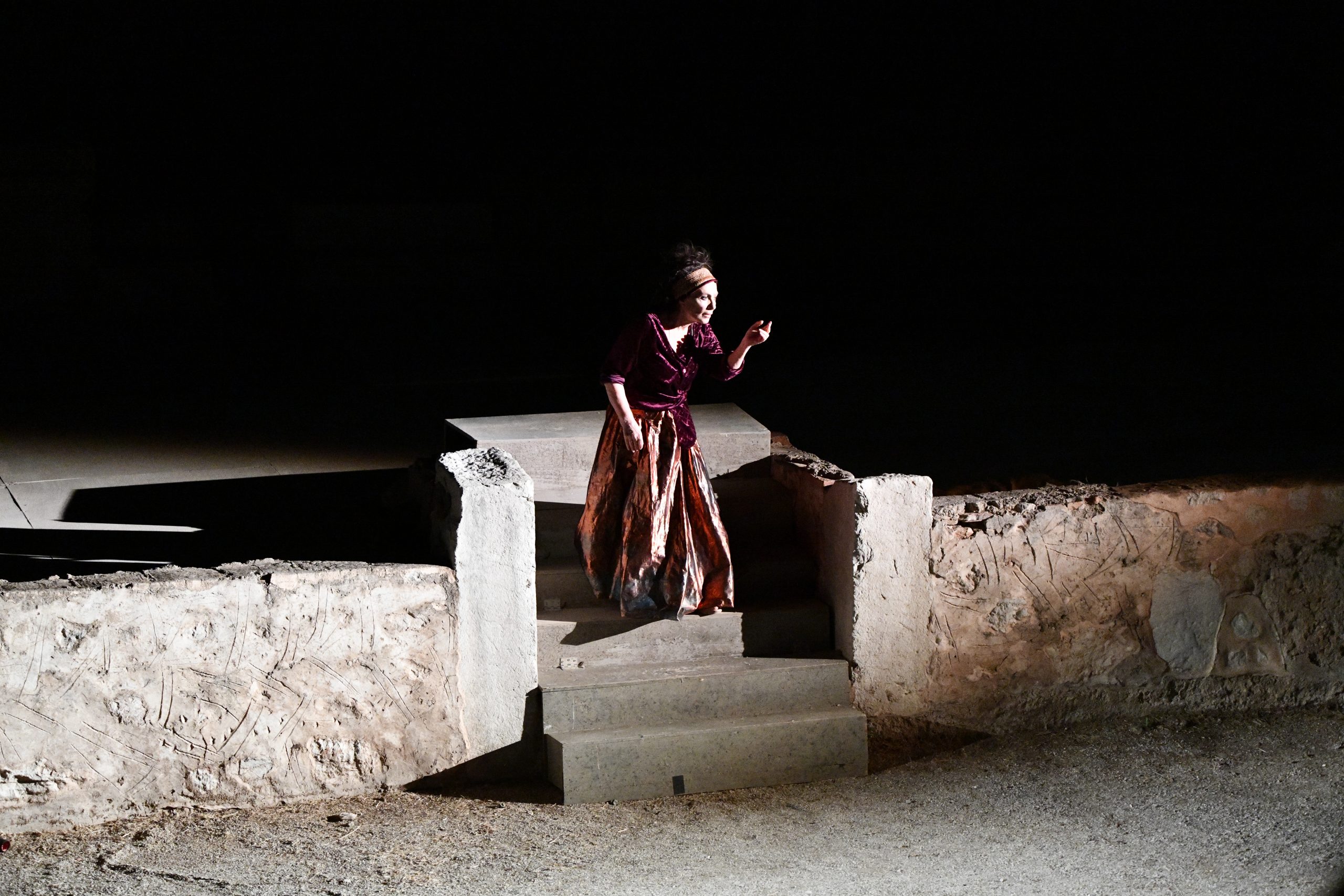 Ενδεδυμένη με τα πέπλα της υποτέλειας και της λαϊκότητας, η Φιλαρέτη Κομνηνού συνθέτει μια ηρωίδα που καυτηριάζει τις ιδιοτροπίες και τις σκοτεινές πλευρές της βασίλισσας, χωρίς να αφήνει απ’ έξω τις δικές της τύψεις. Η έμπειρη ερμηνεύτρια, την οποία έχουμε συνηθίσει σε περισσότερο δραματικούς ρόλους, αποδεικνύεται εξαιρετικά ταλαντούχα και στην κωμωδία, αξιοποιώντας τόσο τα γρήγορα αντανακλαστικά της όσο και την αστείρευτη ενέργειάς της επί σκηνής. Φυσικά, παρά την κωμική υφή του μονολόγου, η ερμηνεία της δεν παρακάμπτει το έντονο στοιχείο της ενοχής που δηλητηριάζει τον νου αυτής της γυναίκας, η οποία γίνεται άθελα της συνένοχη στην καταστροφή τριών ανθρώπινων ζωών. Σε ωραία αντίθεση έρχεται ο λαμπερός χαρακτήρας των κοστουμιών της Ιωάννας Τσάμη, τα οποία υπογραμμίζουν την ανάδυση της δούλας από την αφάνεια στο απόλυτο φως