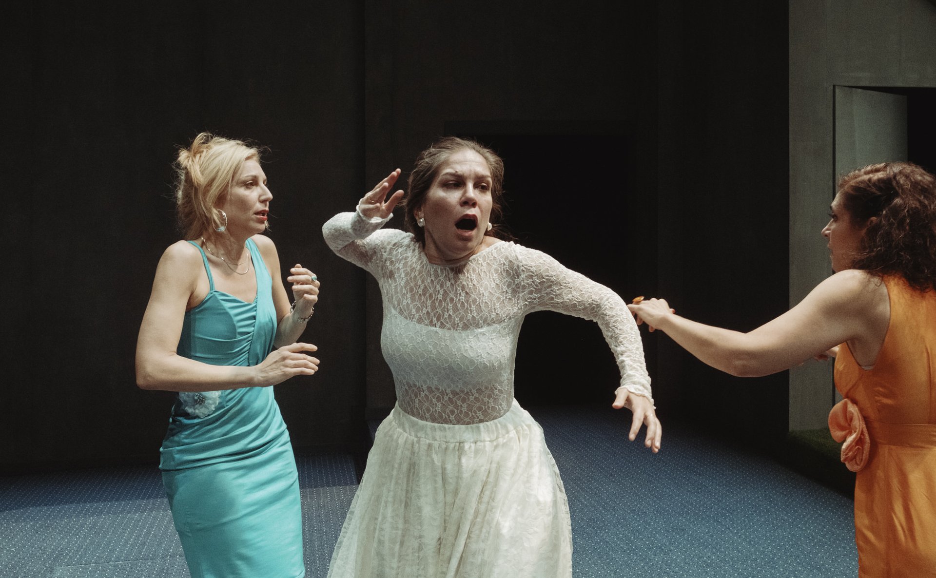 Αρωγός στην ανάδειξη των προβληματισμών του κειμένου, γίνεται το δεμένο σύνολο των ηθοποιών, οι οποίοι δίνουν τον καλύτερο τους εαυτό επί σκηνής. Από τον πολυμελή θίασο, ξεχωρίζουν η Άννα Καλαϊτζίδου, η Σύρμω Κεκέ και η Ελίνα Ρίζου στους ρόλους των τριών αδελφών. Η Άννα Καλαϊτζίδου, έχοντας σταθερά μια εξαιρετική σκηνική παρουσία, αποδεικνύει για άλλη μια φορά πόσο ευφυώς διαχειρίζεται ερμηνευτικά τα ερεθίσματα του έργου, βαδίζοντας σε μια πορεία που την οδηγεί στην θνητή και βαθιά ανθρώπινη φύση της ηρωίδας. Η Σύρμω Κεκέ, παίζοντας με την ένταση του βλέμματός της αλλά και τα διαφορετικά ηχοχρώματα της φωνής της, σκιαγραφεί μια γυναίκα θωρακισμένη πίσω από τις βεβαιότητές της, που αρνείται να αντικρίσει μια πραγματικότητα που διαρκώς μεταβάλλεται. Η Ελίνα Ρίζου, στον ρόλο της μικρότερης αδερφής, περνώντας από τη χαριτωμένη αθωότητα στην βίαιη συνειδητοποίηση της κατάρρευσης του οικογενειακού ιστού, συνθέτει μια πολυεπίπεδη γυναικεία φιγούρα με πλούσιο εσωτερικό υπόβαθρο.