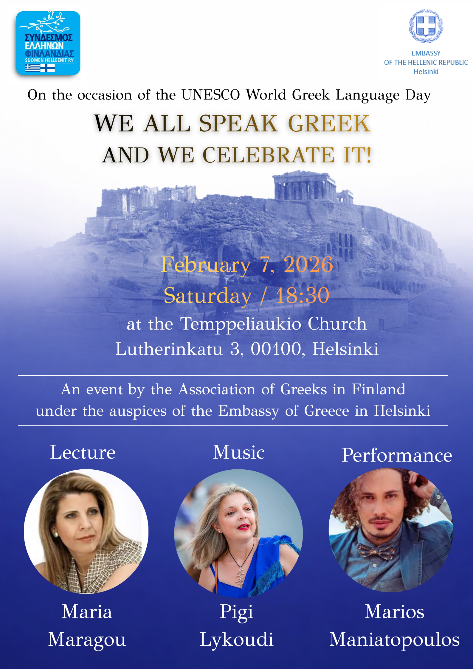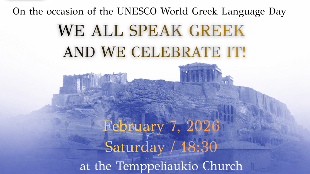 την Παρασκευή 6 Φεβρουαρίου 2026, 15:30–17:00, στον Χώρο Εκδηλώσεων του Ευρωπαϊκού Σχολείου, οδός Bulevardi 18 και το Σάββατο 7 Φεβρουαρίου 2026, στις 18:30, στην Temppeliaukio Church (Church of the Rock), οδός Lutherinkatu 3, 00100, Ελσίνκι παρουσίᾳ της Ελληνίδας Πρέσβεως στη Φινλανδία, κ. Ναταλίας Μ. Καραγεώργου, η οποία τιμά την εκδήλωση, θα ανακαλύψουμε το βάθος και τον πλούτο του Ελληνικού Πνεύματος, βιώνοντας μελωδικά τα νοήματά του.