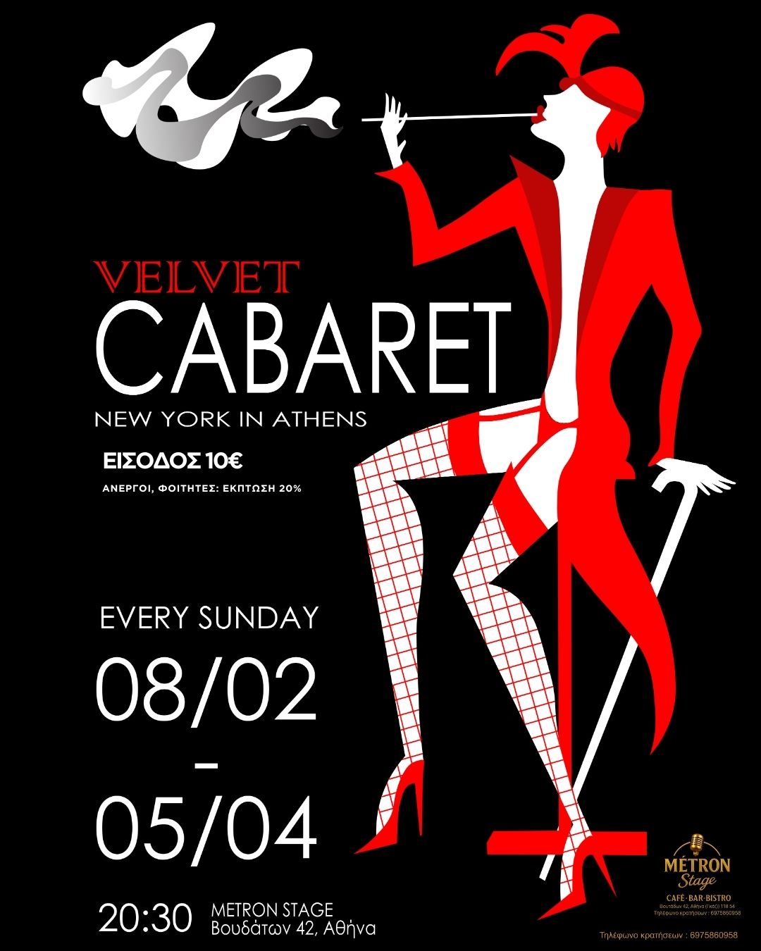 - Κάθε Κυριακή από 8 Φεβρουαρίου Ι Velvet Cabaret – NY in Athens Ι Ώρα έναρξης Ι 20:30 Ι Είσοδος: 10€