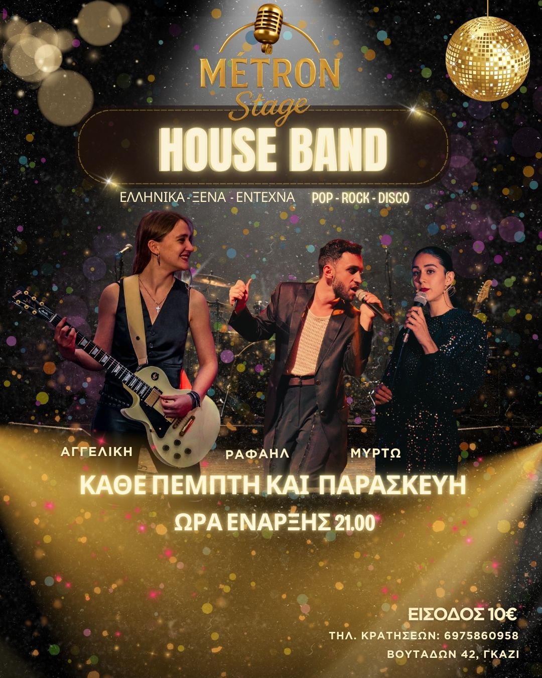 Παράλληλα, το MÉTRON Stage καθιερώνει τη δική του House Band, η οποία εμφανίζεται κάθε Πέμπτη και Παρασκευή. Στη σκηνή συναντιούνται η Αγγελική Βλαχάκη, τραγουδοποιός και ερμηνεύτρια με ενεργή παρουσία στη σύγχρονη ελληνική σκηνή, ο Ραφαήλ Κριτούλης, τραγουδιστής με σπουδές στο κλασικό και σύγχρονο τραγούδι, και η Μυρτώ Χαλέμη, ερμηνεύτρια με κλασική εκπαίδευση και σπουδές musical theatre στη Νέα Υόρκη. Μαζί παρουσιάζουν ένα live με pop, rock και disco αναφορές, εμπνευσμένο από τα house bands μεγάλων venues του εξωτερικού, δίνοντας τον ρυθμό στις βραδιές του χώρου.